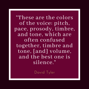 Our discussion turns toward voice branding and “signature” voices, such as David’s work as the voice of CTV News over the past fourteen years. “In the old days, there were guys, [and] fewer women now that I think about it, but there were people who were signature voices, and when you got that signature voice to be the voice of your brand, it was a major coup.” We talk about such iconic signature voices as Mason Adams as the voice of Schmuckers and James Earl Jones as the voice of CNN, and David shares his seven “colors” of the voice. “I think most voice teachers only teach four,” he explains, “but I teach seven and I’ll go through them quick. These are the colors of the voice: pitch, pace, prosody, timbre, and tone, which are often confused together, volume. And the best one is silence.”